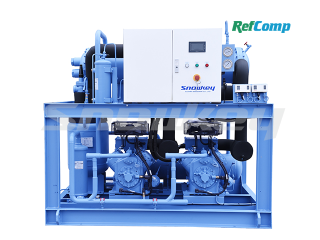 Snowman use RefComp SP compressors for this series of units. The power range is 6- 160HP. Per the request of the customers, the HP of the unit can be as high as 240HP. Units configuration is flexible: units can packaged with water- cooled condenser, air- cooled condenser orwithout  condenser. With many years of experience, the units are user- friendly: suction port, drainage port and oil charge port are all included, rendering easy maintenance   and replacement. Components of the units: RefComp compressor, oil separator, (condenser), suction accumulator, economizer, liquid receiver, control center,  etc..